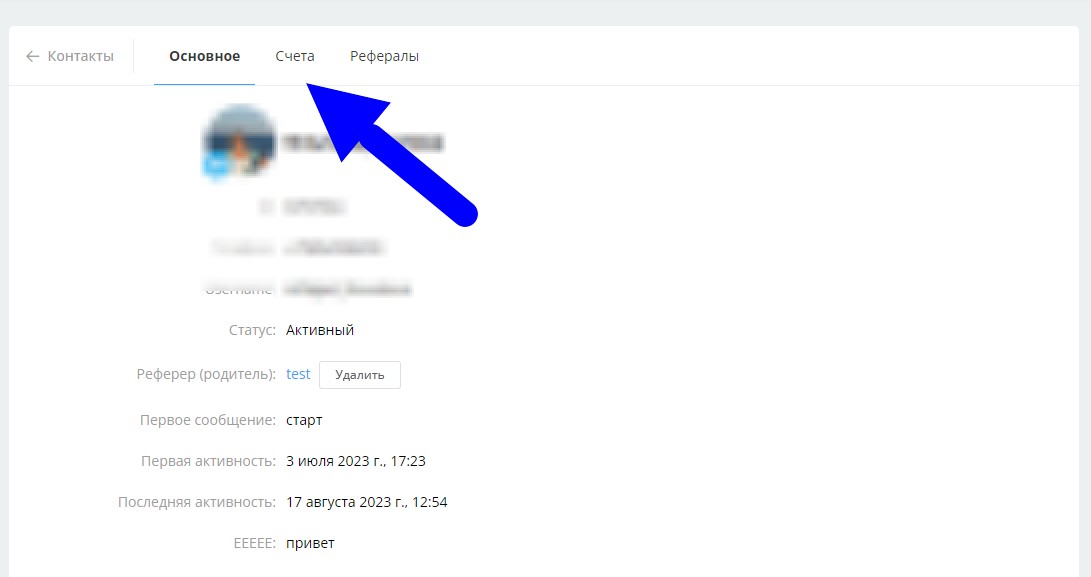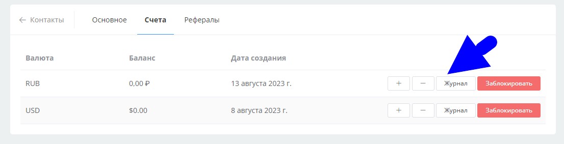 При пополнении через данный блок информация будет доступна в разделе Счета карточки контакта.